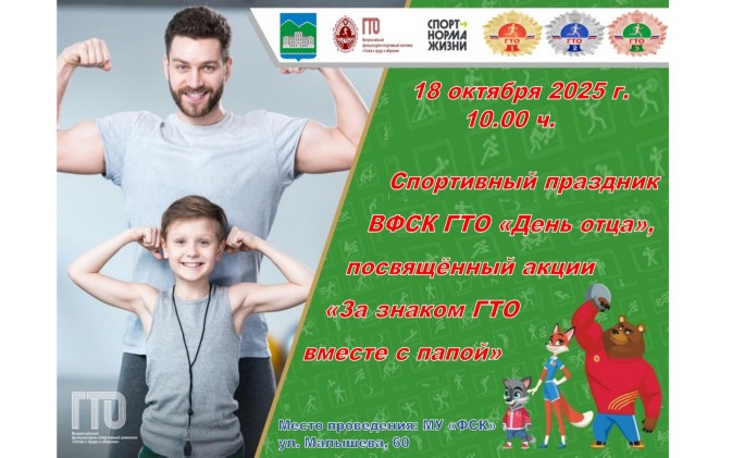 Управление по физической культуре и спорту администрации Кыштымского городского округа совместно с Центром тестирования Всероссийского физкультурно-спортивного комплекса ГТО г. Кыштыма приглашает 18 октября 2025 г. на Спортивный праздник ВФСК ГТО «День отца», посвященный акции «За знаком ГТО вместе с папой».
